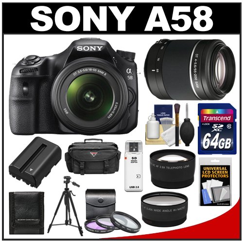 | Sony Alpha SLT-A58 Translucent Mirror Technology Digital SLR Camera Body & 18-55mm Lens with 55-200mm Lens + 64GB Card + Case + Battery + Tripod + Filters + Tele/Wide Lens Kit |